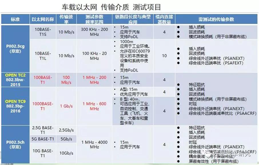 以太網(wǎng)技術(shù)這么好,怎么保證它的質(zhì)量呢?我們需要有量化的數(shù)據(jù)來評判以太網(wǎng)線束的傳輸質(zhì)量,這就涉及到了測試。下圖是目前國際上涉及到車載以太網(wǎng)的相關(guān)技術(shù)標準,準確講還不是汽車以太網(wǎng),而是單線對以太網(wǎng)傳輸介質(zhì)的標準。第一項描述的是用單個線對傳輸10比特每秒的數(shù)據(jù),傳輸距離是1000米,這樣的傳輸應(yīng)用在通信場合,目前是草案階段,很快會成為正式標準公布。第二和第三部分分別是OPEN聯(lián)盟和IEEE同時采用的,OPENTC2工作組研究的是百兆比特每秒傳輸速率的單線對車載內(nèi)的介質(zhì)應(yīng)用,OPENTC9工作組是專門研究千兆以太網(wǎng)的傳輸速率的傳輸介質(zhì),這兩項目前已成為以太網(wǎng)傳輸介質(zhì)主流的發(fā)展方向,未來更高速率的傳輸技術(shù)也在研究中。
