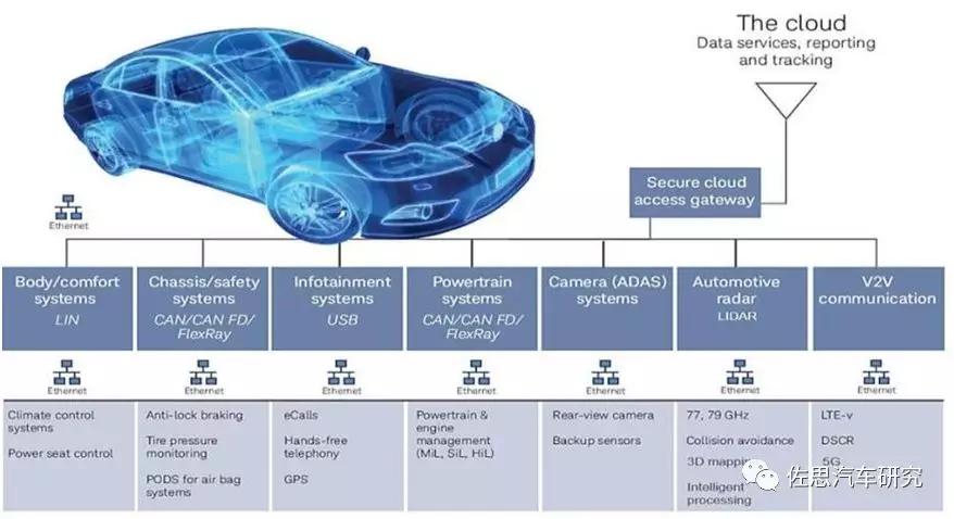 這張圖來源于互聯(lián)網(wǎng),我借用了這張圖,它顯示了目前傳統(tǒng)的汽車內(nèi)部傳輸介質(zhì)的應(yīng)用,都有被車載以太網(wǎng)技術(shù)所取代的趨勢。這里面包括車身與舒適系統(tǒng)(包括座椅的加熱、溫度的調(diào)節(jié)等),底盤安全系統(tǒng),信息娛樂系統(tǒng),動力和傳動系統(tǒng),高級駕駛輔助系統(tǒng)等。這些所有的信息或者信號系統(tǒng)之間的互聯(lián)互通,目前所采用的總線都有改變?yōu)橐蕴W(wǎng)的趨勢。