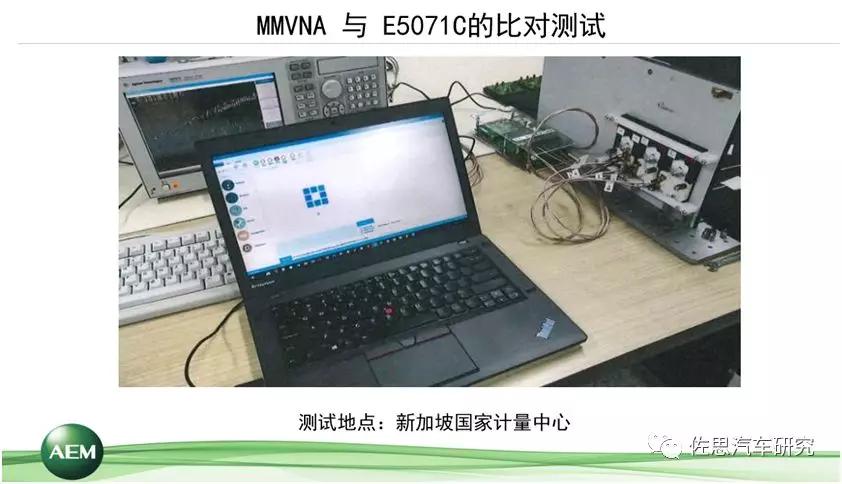 無論是測試方法或者測試設(shè)備,得到的數(shù)據(jù)是不是可信呢?我們和新加坡計量院有密切的合作關(guān)系,我們把所有的這些測試方案都在新加坡計量院做了一個比對。大家可以看到,下圖上這一臺大設(shè)備就是新加坡計量院的實驗室網(wǎng)分,旁邊的就是我剛才給大家展示的,實驗室狀態(tài)下我們的核心部件連接到線束以后的狀態(tài)。中間這臺電腦驅(qū)動核心部件,完成測試。